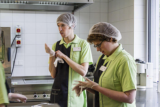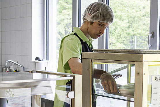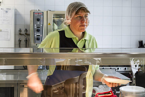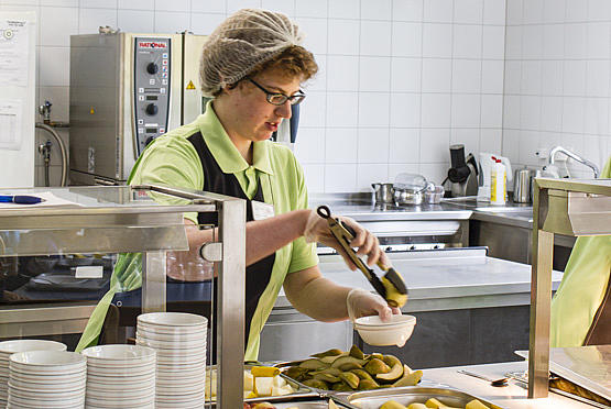 Die 13 Beschäftigten der Hauswirtschaft helfen, die in der Aumühle lebenden und arbeitenden Menschen zu versorgen. Der Aufgabenbereich ist vielschichtig. So geben sie beispielsweise das gelieferte Mittagessen aus, bereiten Snacks für die Pausen vor und stellen sie bereit. Aber auch die Reinigung der Sanitärbereiche in der Werkstatt fällt in ihre Verantwortung.