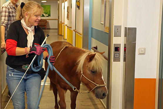 Ungewöhnlicher Besuch von Pony Schneewittchen, das eine Ausbildung als Therapiepferd gemacht hat, im Septembe 2019.