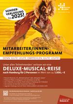 Unter allen Mitarbeiter*innen und Azubis, die im Jahr 2025 erfolgreich eine*n neue*n Kolleg*in gewinnen, verlosen wir im Sommer 2026 zusätzlich eine Deluxe-Musical-Reise für Zwei im Wert von ca. 1.500 Euro!!!