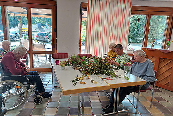 Auf die Bewohnerinnen und Bewohner wartete eine Auswahl bekannter Gesellschaftsspiele, ein kreatives Bastelangebot mit Naturmaterialien, wie Hortensienblüten und Hagebutten, sowie das Ratespiel „Fast vergessene Begriffe aus alten Zeiten“. Begriffe wie „Oheim“, „Muckefuck“ oder „Hasenbrot“ waren schnell erklärt – und sofort wurden persönliche Erinnerungen und Geschichten aus dem Leben erzählt. Bei „Affenschaukel“ war etwas mehr Überlegung gefragt, und so berichteten einige Damen von früheren Zeiten mit langen Zöpfen. Und was war noch einmal eine „Putzmacherin“?