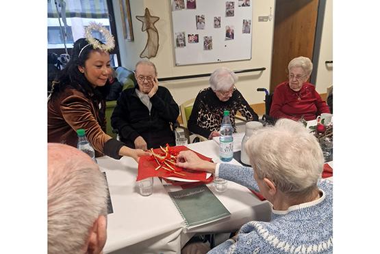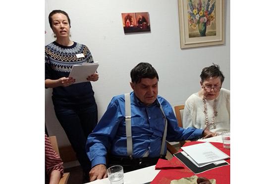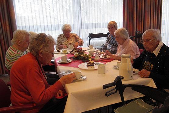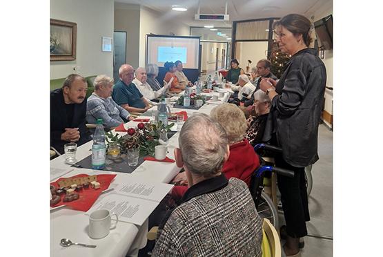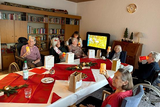 Im Wohnbereich A im Obergeschoss wurde das Fest aktiv von den Bewohnerinnen und Bewohnern mitgestaltet. Begleitet von Beamer-Projektionen und musikalischen Videoclips wurde gemeinsam gesungen. Besonders berührend war, dass einige ihre selbst ausgewählten Weihnachtsgedichte und -geschichten vorlasen und damit ihre persönlichen Erinnerungen und Gedanken teilten.