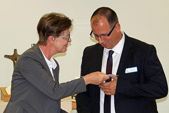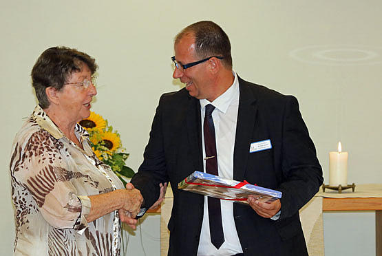 Stadträtin Christa Olbertz überreicht – in Vertretung des Bürgermeisters Dr. Marius Hahn – Herrn Leifeld ein Präsent.
