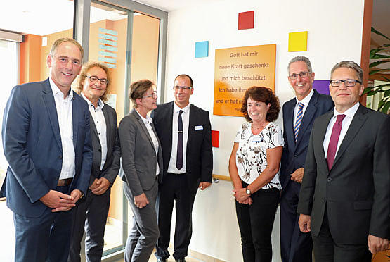 Landrat Michael Köberle, Stephan Zimmermann, Marion Schardt-Sauer, Michael Leifeld, Astrid Wolf, Pfarrer Dr. Klaus Bartl und Gerd Brückmann (v. L. nach Re.)