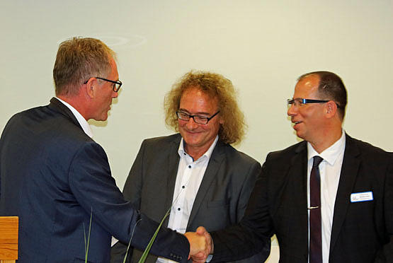 Michael Köberle, Landrat, gratuliert Michael Leifeld.