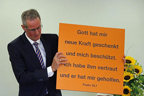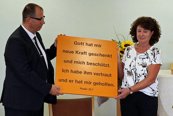 Pfarrer Dr. Klaus Bartl überreicht den Segensspruch, den die Geschäftsführung der Mission Leben und die Mitglieder des Fördervereins Diakonie Limburg ausgewählt haben.