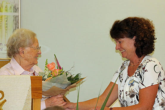Astrid Wolf, stellvertretende Einrichtungsleiterin, überreicht Frau Hammerschlag einen Blumenstrauß