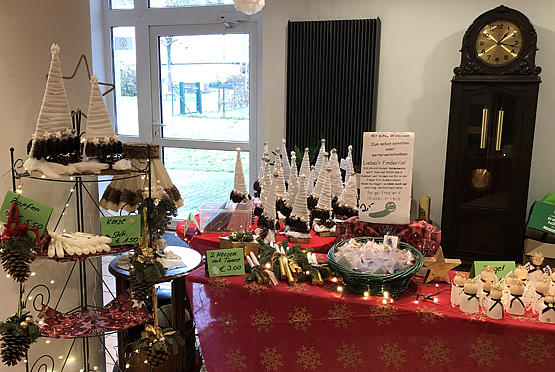 Der erste Weihnachtsmarkt am 2. Adventssamstag 2023 war ein voller Erfolg: mit einem Waffelstand in der Cafeteria, Pavillons auf der Terrasse.
