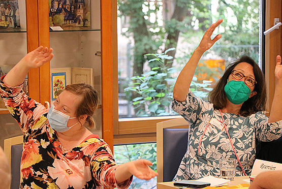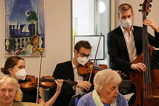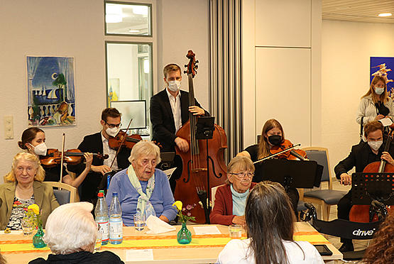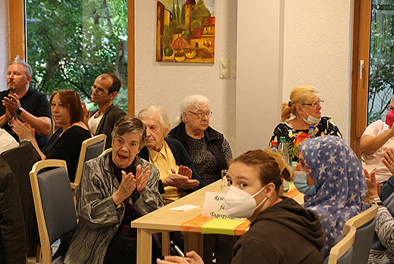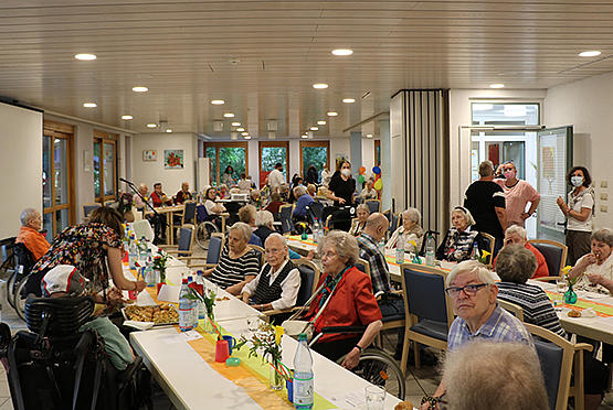 Höhepunkt des Festes war ein selbst produzierter kurzer Film: Bewohner*innen, Tagesgäste, Mitarbeitende und Auszubildende erzählten vor der Kamera, was ihnen am Martinsstift so gut gefällt, welche Gruppenangebote besonders toll sind und für was sie dankbar sind. Die Idee dazu hatten Mitarbeitende des Sozialdiensts. Der 15-minütige Film bot Schmunzelmomente und Anrührendes - wie gehofft, kam er bestens an