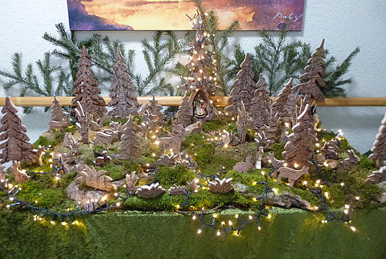 Holzarbeit „Waldimpressionen und Krippe“, die in Handarbeit hergestellt wurde: Das Modell wurde von Familie Brunner im Foyer aufgebaut und dekoriert.