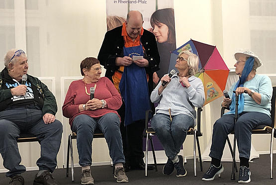 Fröhliche Bewohner*innen bei einer Sitzung.