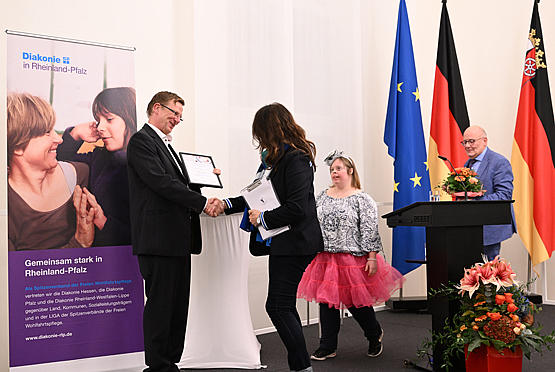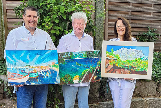 Maler Raymond Pauquet schenkte im September 2024 der Einrichtung drei Landschaftsgemälde. Einrichtungsleiter Daniel Plavzyk, der Künstler und Tagespflegeleiterin Maria Hirschmann (v.l. nach r.)