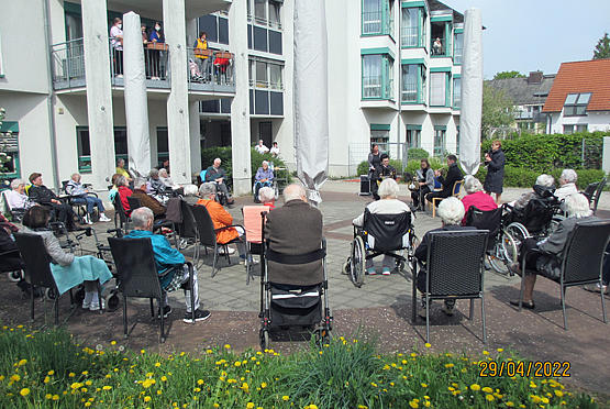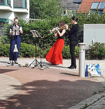 Gartenkonzert im Juni 2023 mit dem Trompeten „Trio Trimana“ – ein Zusammenschluss junger, internationaler Musiker*innen, die sich über die „Live Music Now“ Yehudi Menuhin Schule/Frankfurt zusammengetan haben. Die Bewohner*innen erlebten gemeinsame Momente des Glücks.
