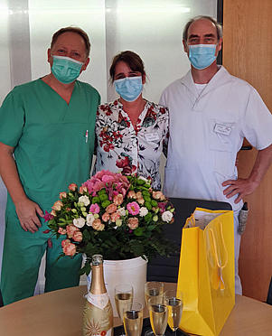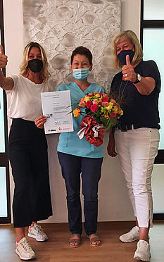 Die langjährige Pflegefachkraft Jovanka Vujcic (Mitte) hat im Mai 2022 die Prüfung zur Wundexpertin Wundexpertin ICW® bestanden. Pfegedienstleiterin Svenja Kruse und Einrichtungsleiterin Regine Kamps-Steiger (rechts) gratulieren.