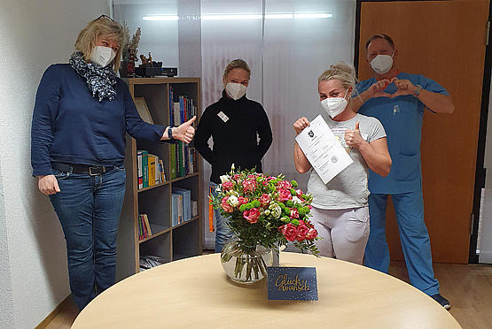 Eva-Maria Koch wurde zur examinierten Pflegefachkraft im Dezember 2020 gratuliert. Einrichtungsleiterin Regine Kamps-Steiger, D. Wagner, Eva-Maria Koch, M. Gottowik-Förster (von Links nach Rechts)