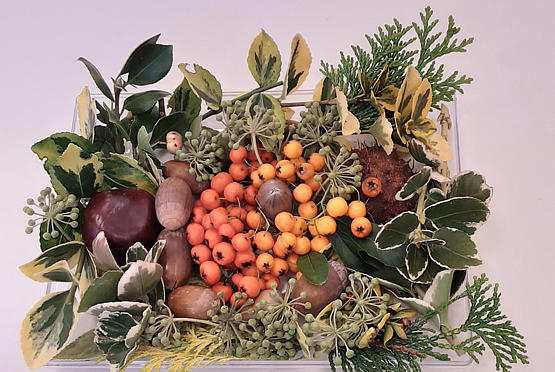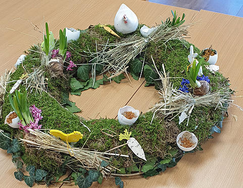 Eine Betreuungskraft hat mit den Bewohner*innen 2023 einen Osterkranz hergestellt und dabei überwiegend Naturmaterialien gewählt.