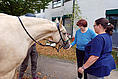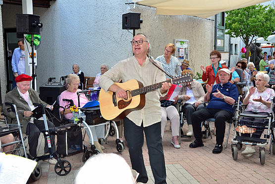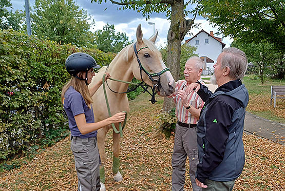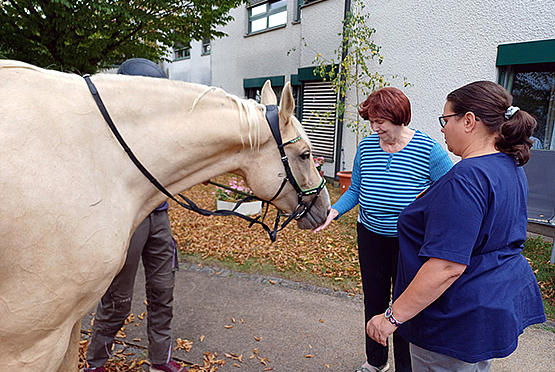 Der hellbrauche Hengst Sancho war im September 2025 zu Besuch im Garten des Altenzentrums und zog alle in seinen Bann.