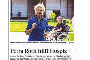 Petra Roth überbrachte im August 2020 dem Hospiz Am Wasserturm bzw. der Hospiz Stiftung Rotary Rodgau eine Spende von 2.000 Euro. Sie ist Kuratorin der Frankfurter Werte-Stiftung, die schon den Grundstein mit einer Million Euro gelegt hatte. Die Spende wurde zur Finanzierung des Hospizbetriebs genutzt.
